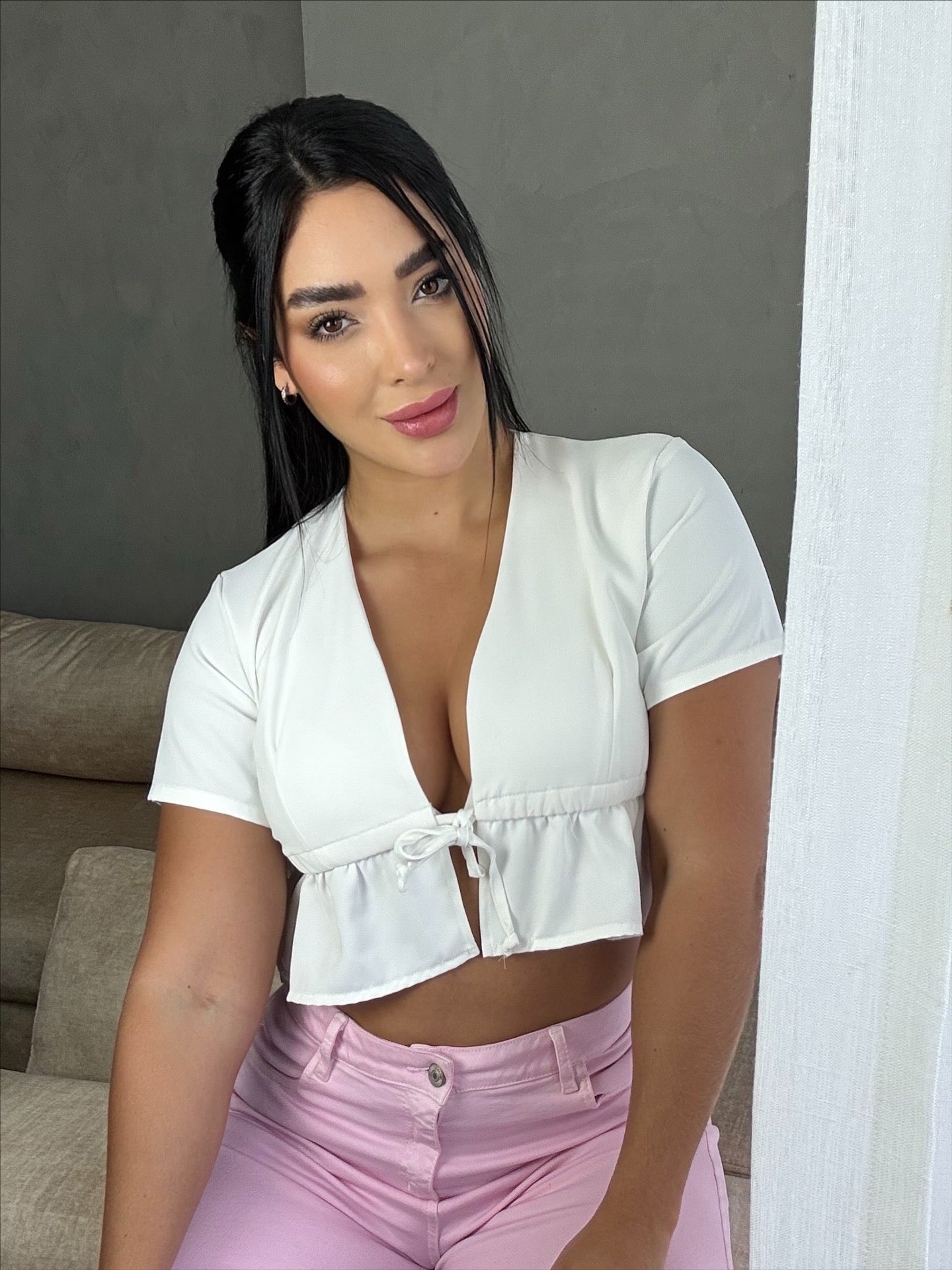 Crop Top Blanco con Amarre Frontal. Diseñado para destacar la silueta con un toque de sensualidad sutil. El detalle de amarre al frente permite ajustarlo a tu gusto, mientras que el escote en V realza el busto sin perder elegancia.