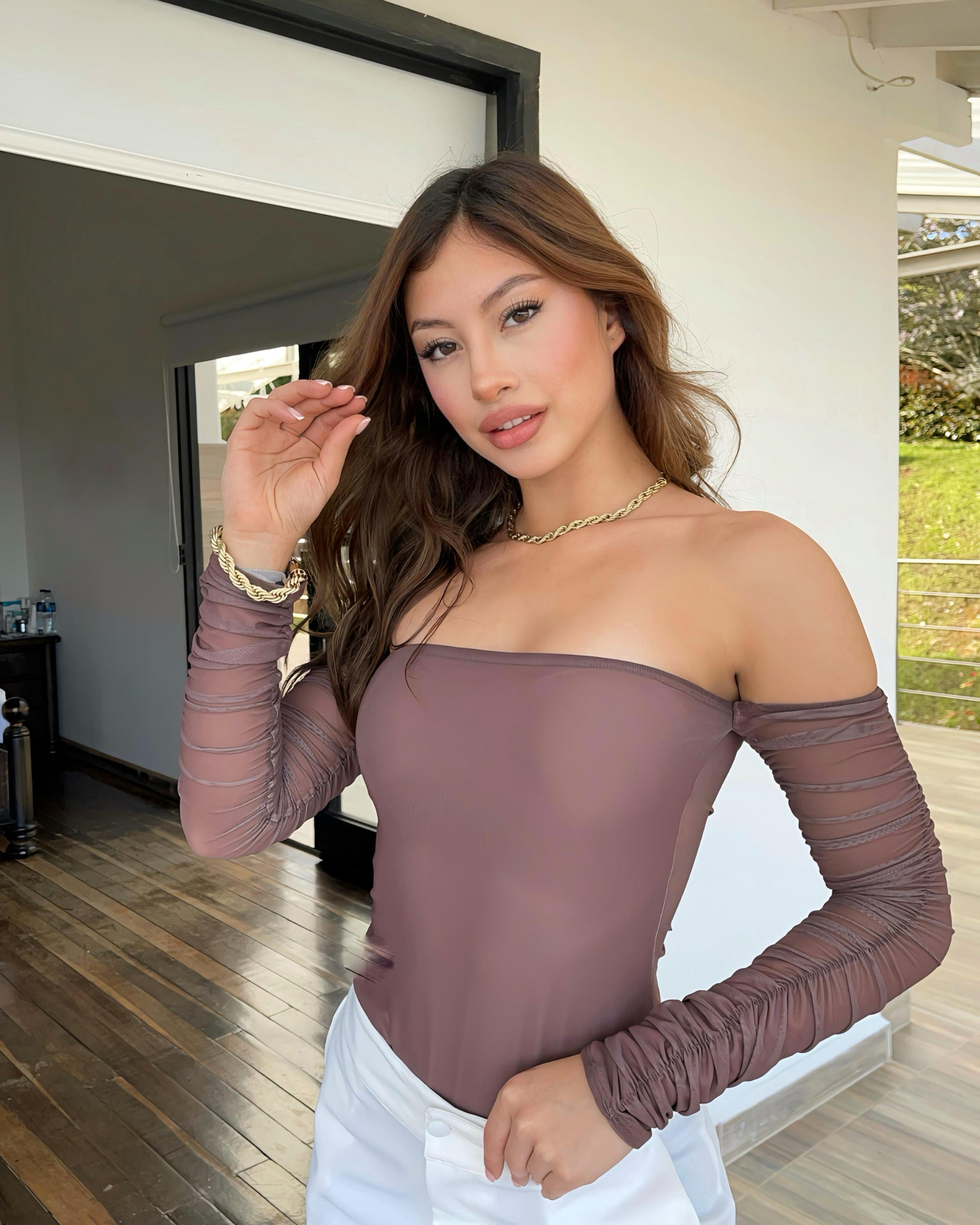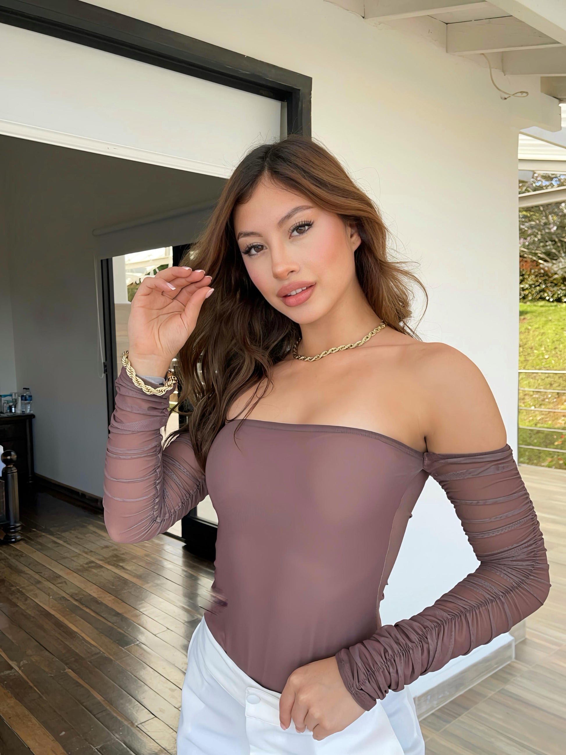 Nuestro body en mesh de manga larga es la prenda ideal para crear looks increíbles. Estraple, hombros al descubierto y mangas con recogido, resalta tu figura con una silueta ceñida que se adapta como una segunda piel. Estilo tipo tanga con broche inferior para mayor practicidad. Cómodo, versátil y con doble tela en la parte delantera: una pieza que vas a querer usar una y otra vez.
