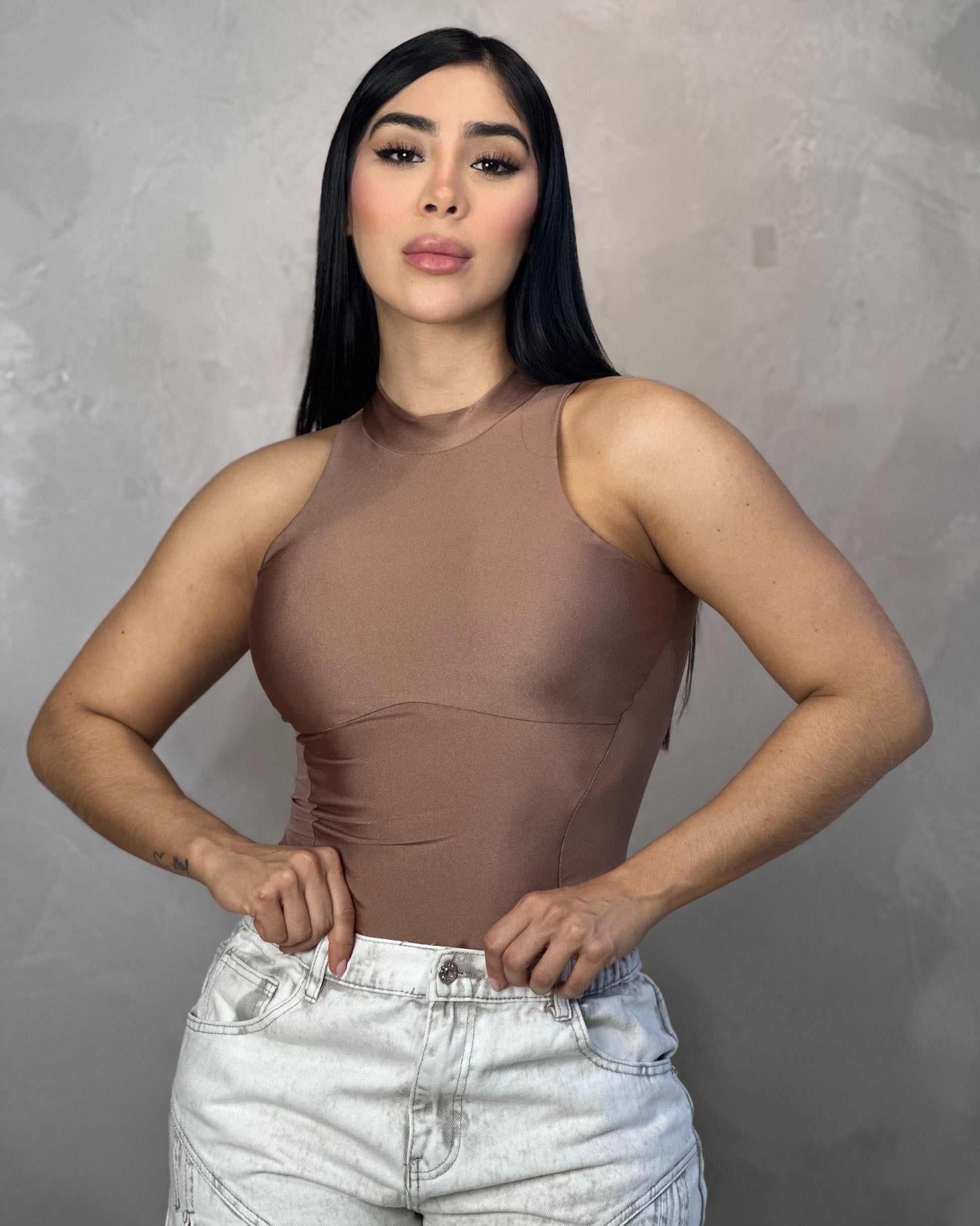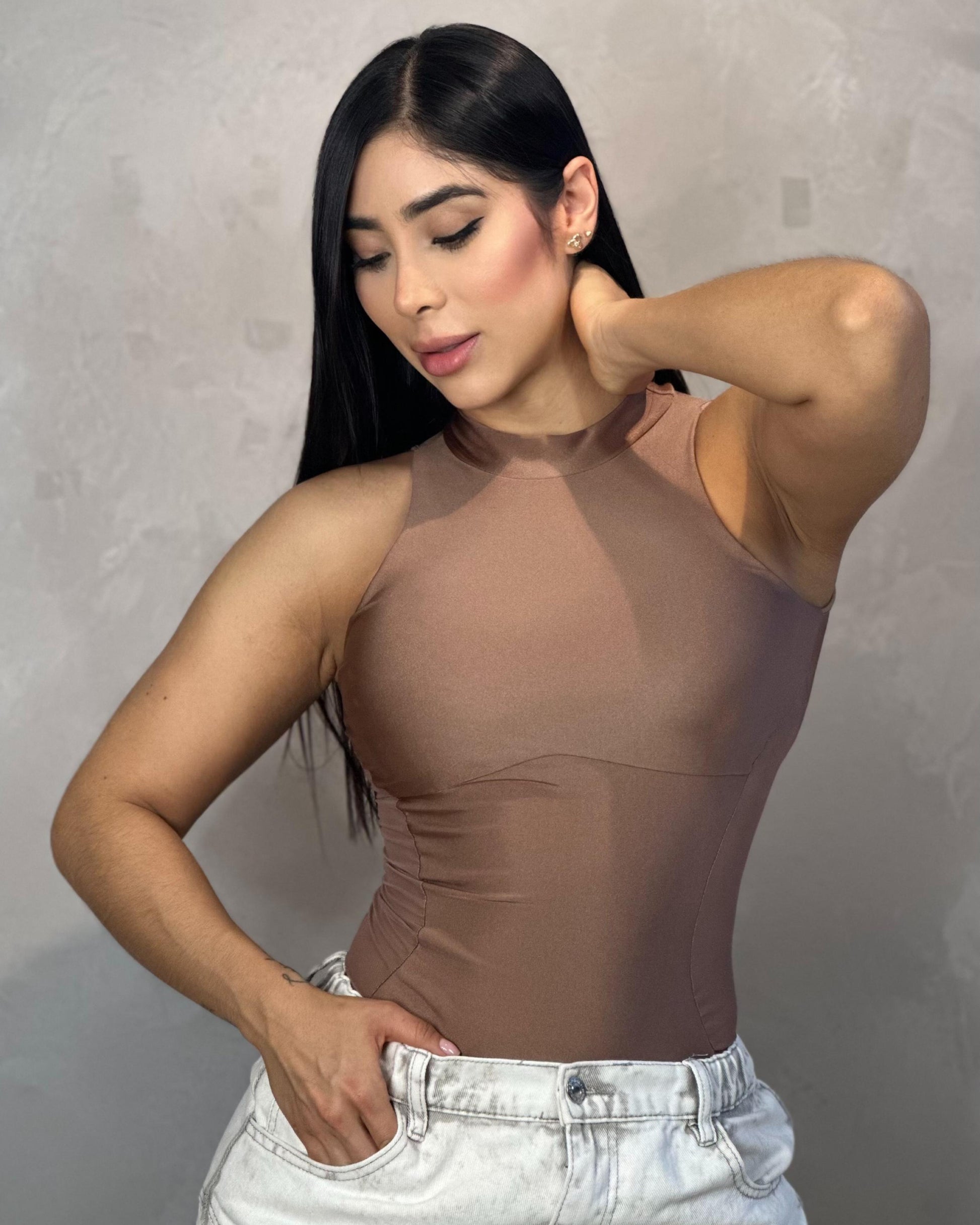 Body mocca con transparencias laterales. Con cuello redondo y manga sisa, este body estiliza la parte superior del cuerpo mientras revela sutilmente los costados con paneles en malla translúcida. Ideal para looks nocturnos, salidas con amigas o cenas especiales donde el estilo y la actitud marcan la diferencia.