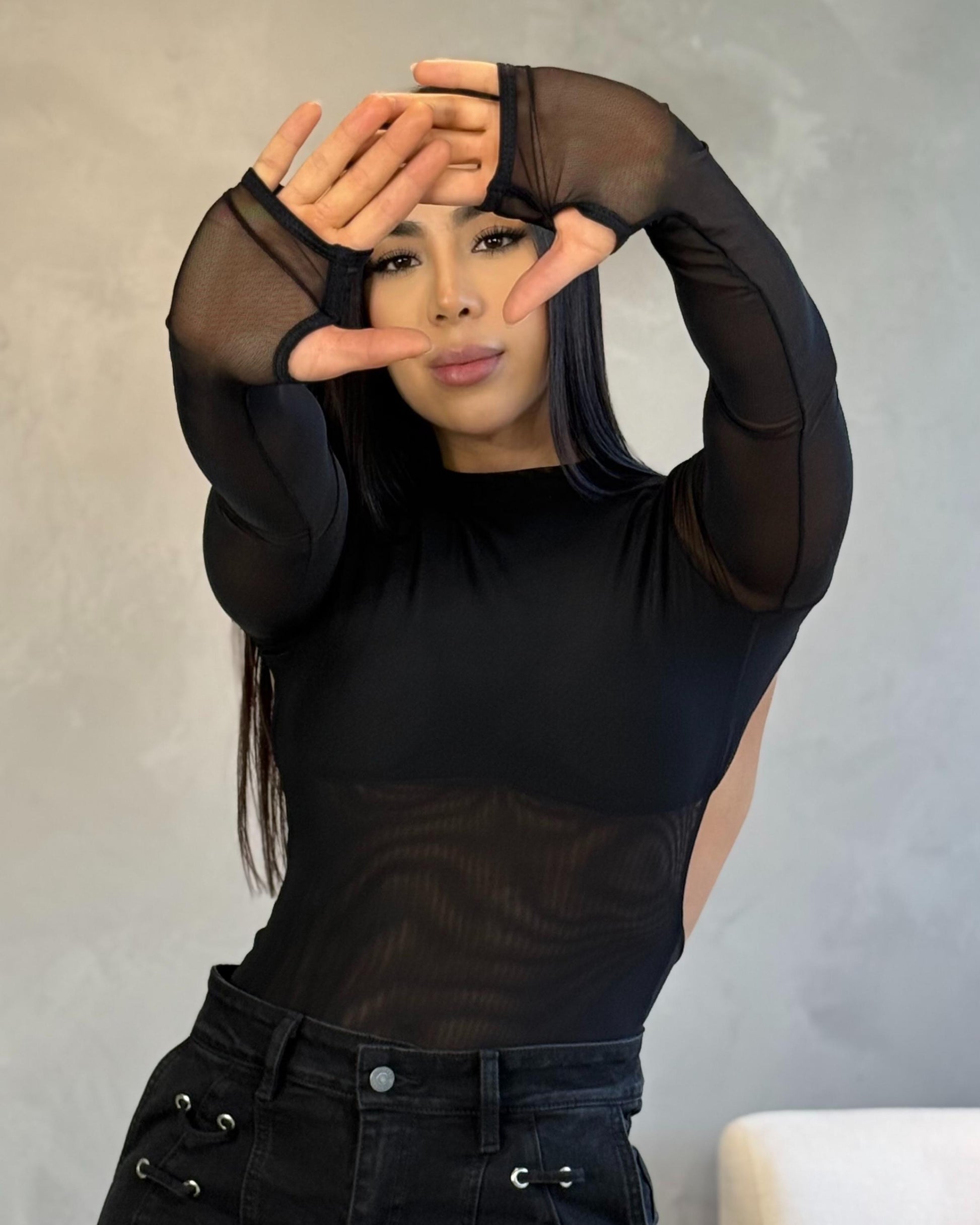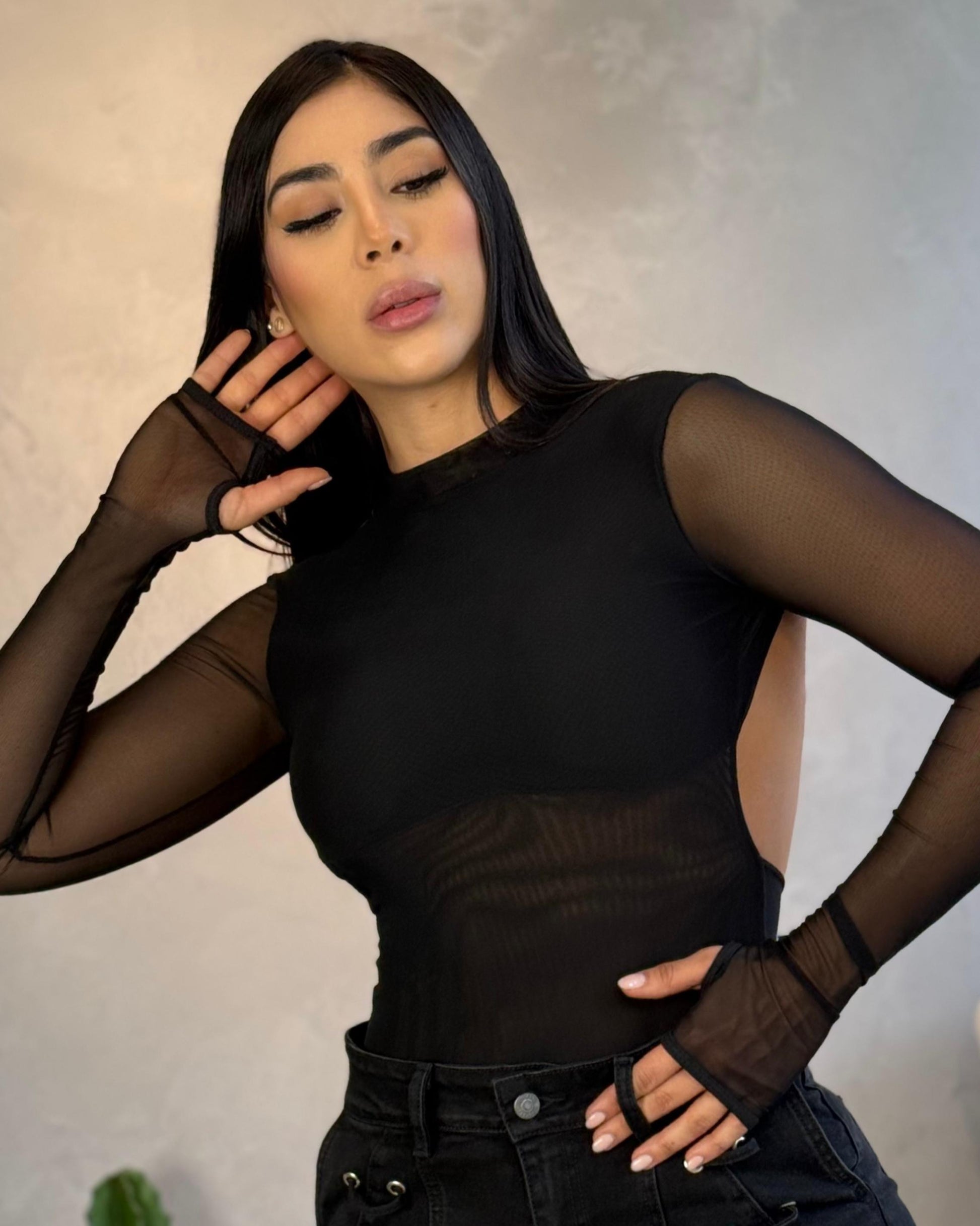 Body negro mesh con diseño de alto impacto y sofisticación. Con mangas largas y cuello alto, esta pieza combina sensualidad y elegancia a través de un juego de transparencias. Con la espalda semidescubierta y el ajuste ceñido al cuerpo enmarcan la silueta de forma audaz y estilizada. Es la prenda ideal para looks nocturnos o salidas especiales, donde el protagonismo y el estilo son esenciales.