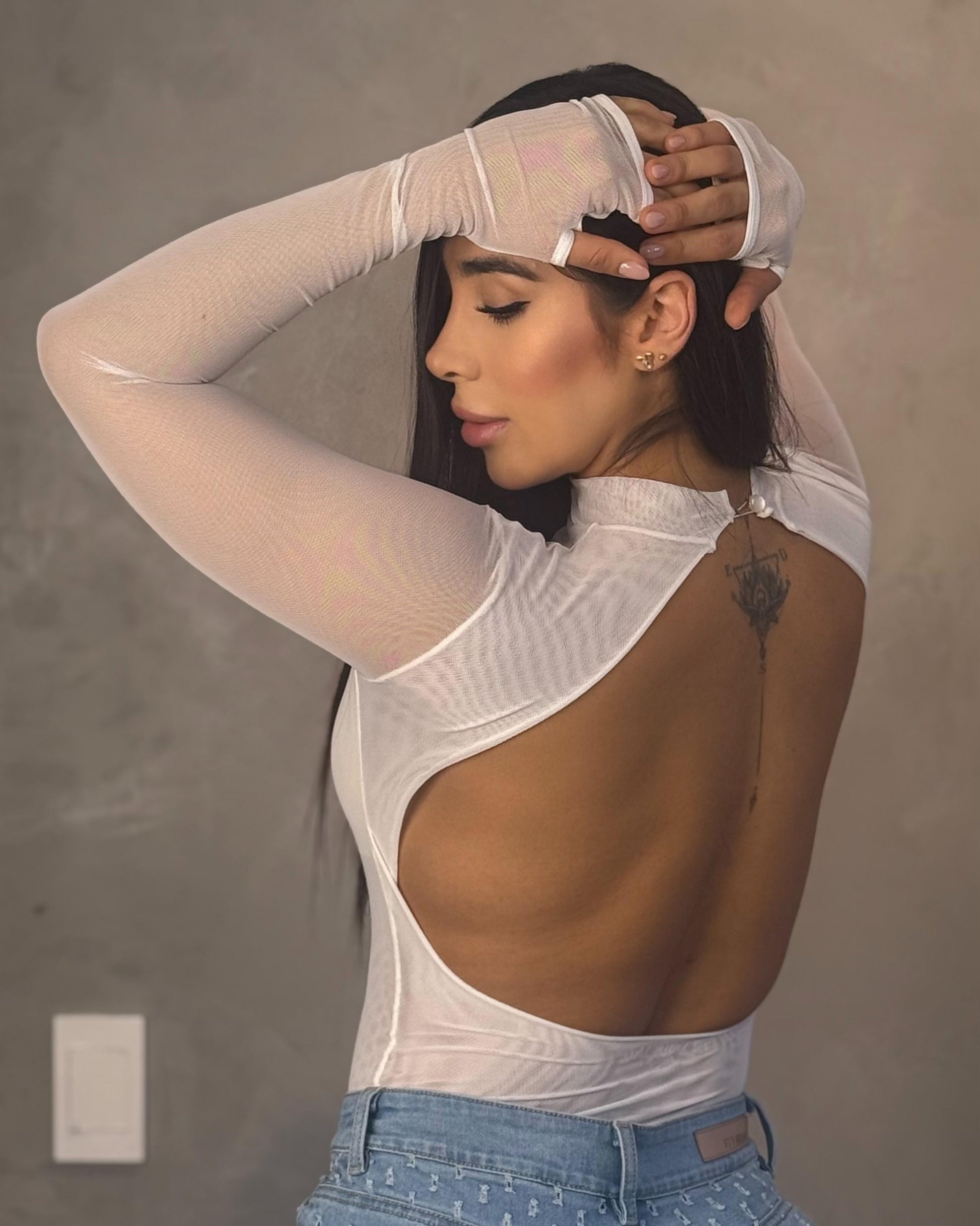 Body marfil mesh con diseño de alto impacto y sofisticación. Con mangas largas y cuello alto, esta pieza combina sensualidad y elegancia a través de un juego de transparencias. Con la espalda semidescubierta y el ajuste ceñido al cuerpo enmarcan la silueta de forma audaz y estilizada. Es la prenda ideal para looks nocturnos o salidas especiales, donde el protagonismo y el estilo son esenciales.