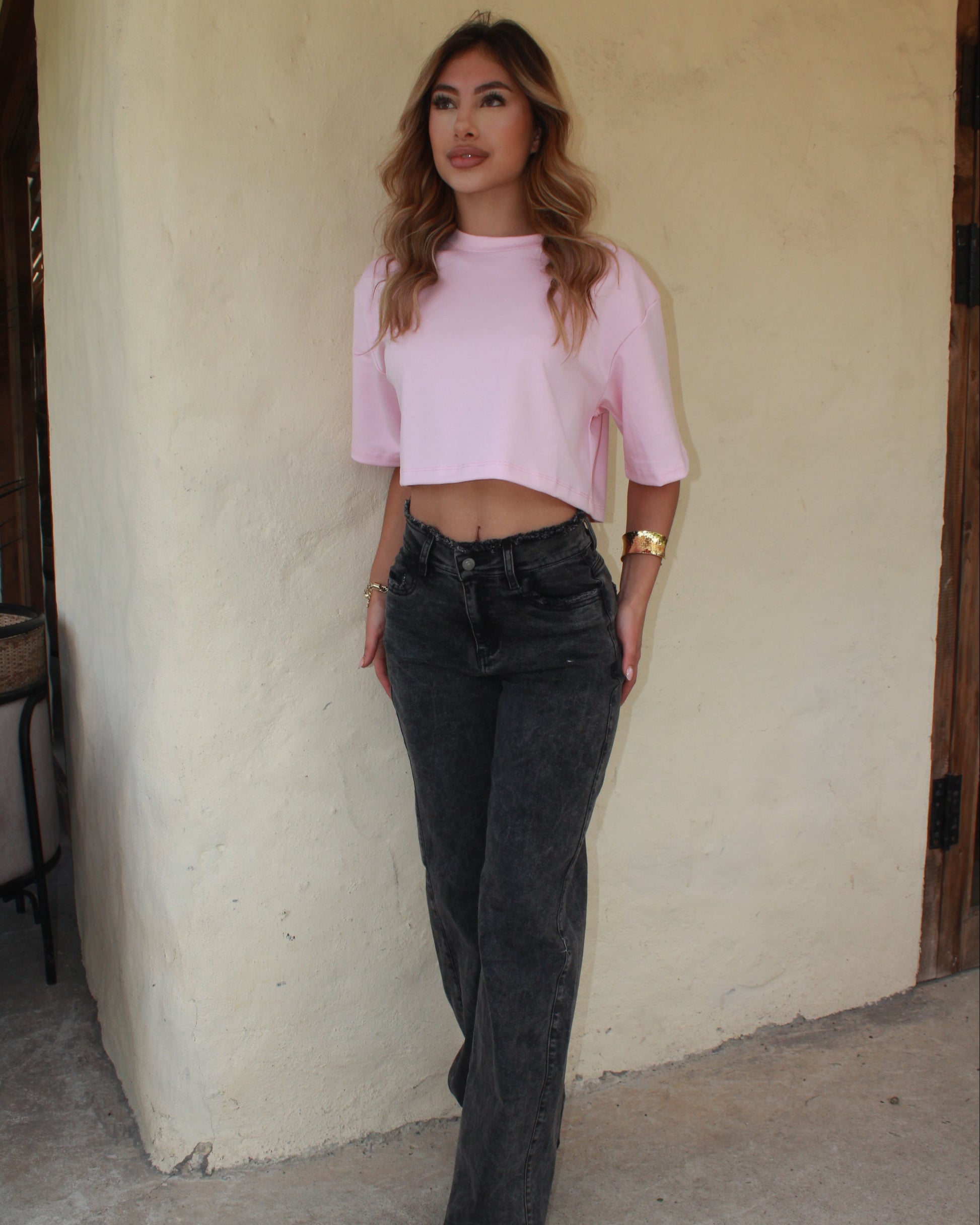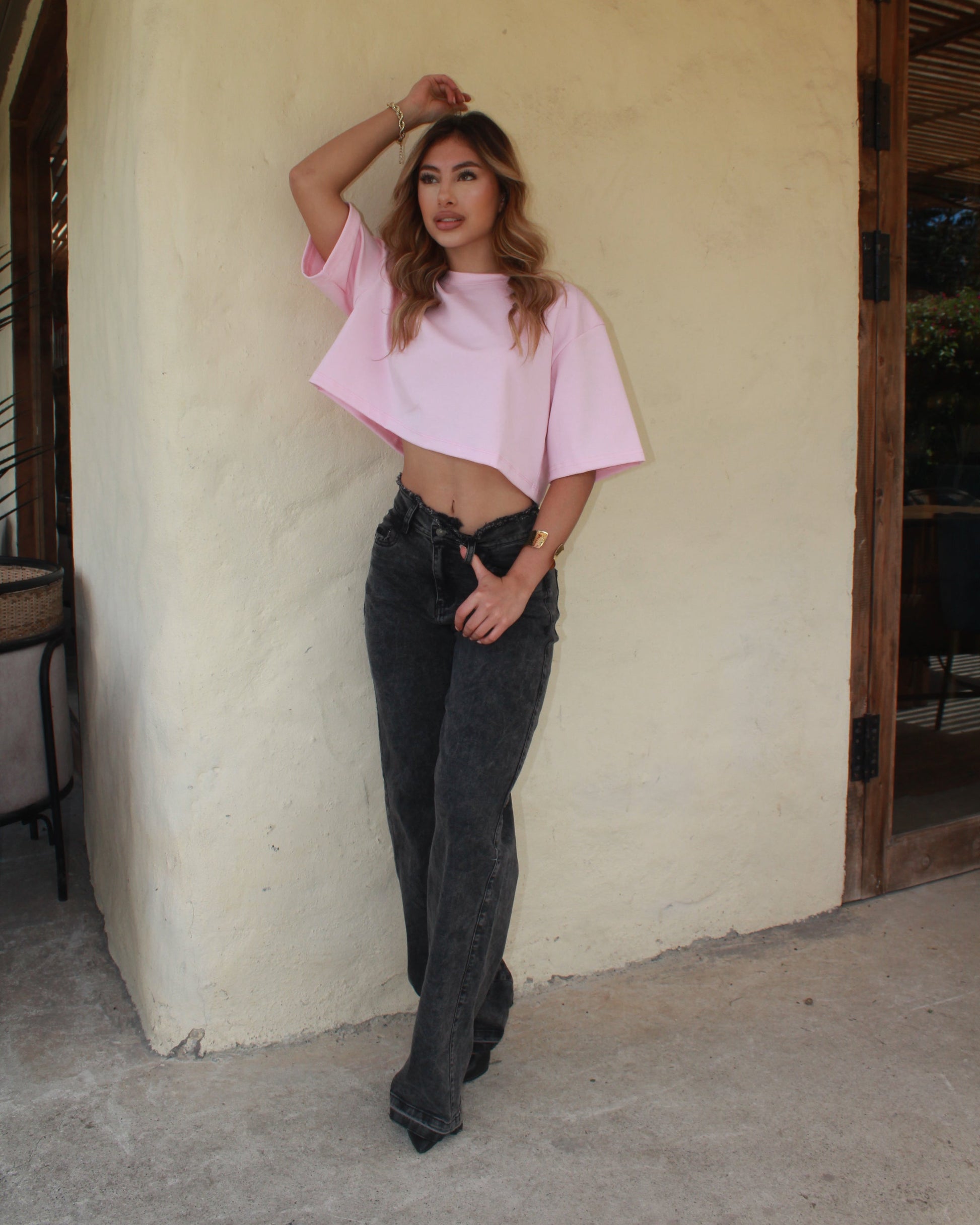 Este jean de tiro alto en tono gris carbón resalta por su estilo urbano y femenino. Su cintura tipo paperbag con efecto recogido añade un toque moderno y favorecedor, que realza la silueta sin perder comodidad. Tiene bota ancha recta, bolsillos traseros amplios y una textura en denim lavado que aporta carácter y versatilidad.