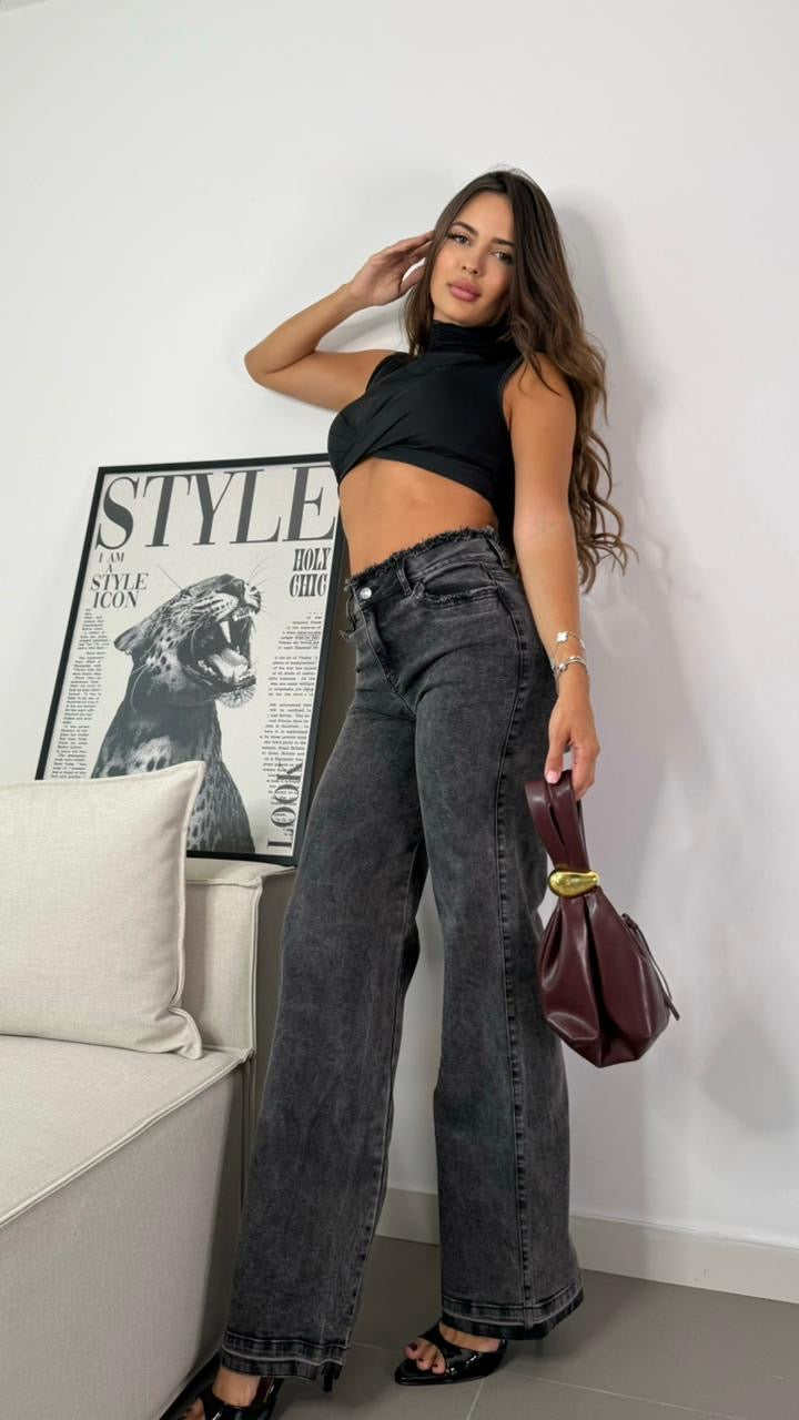 Este jean de tiro alto en tono gris resalta por su estilo urbano y femenino. Su cintura tipo paperbag, que realza la silueta sin perder comodidad. Tiene bota ancha recta, bolsillos traseros y una textura en denim lavado que aporta carácter y versatilidad.