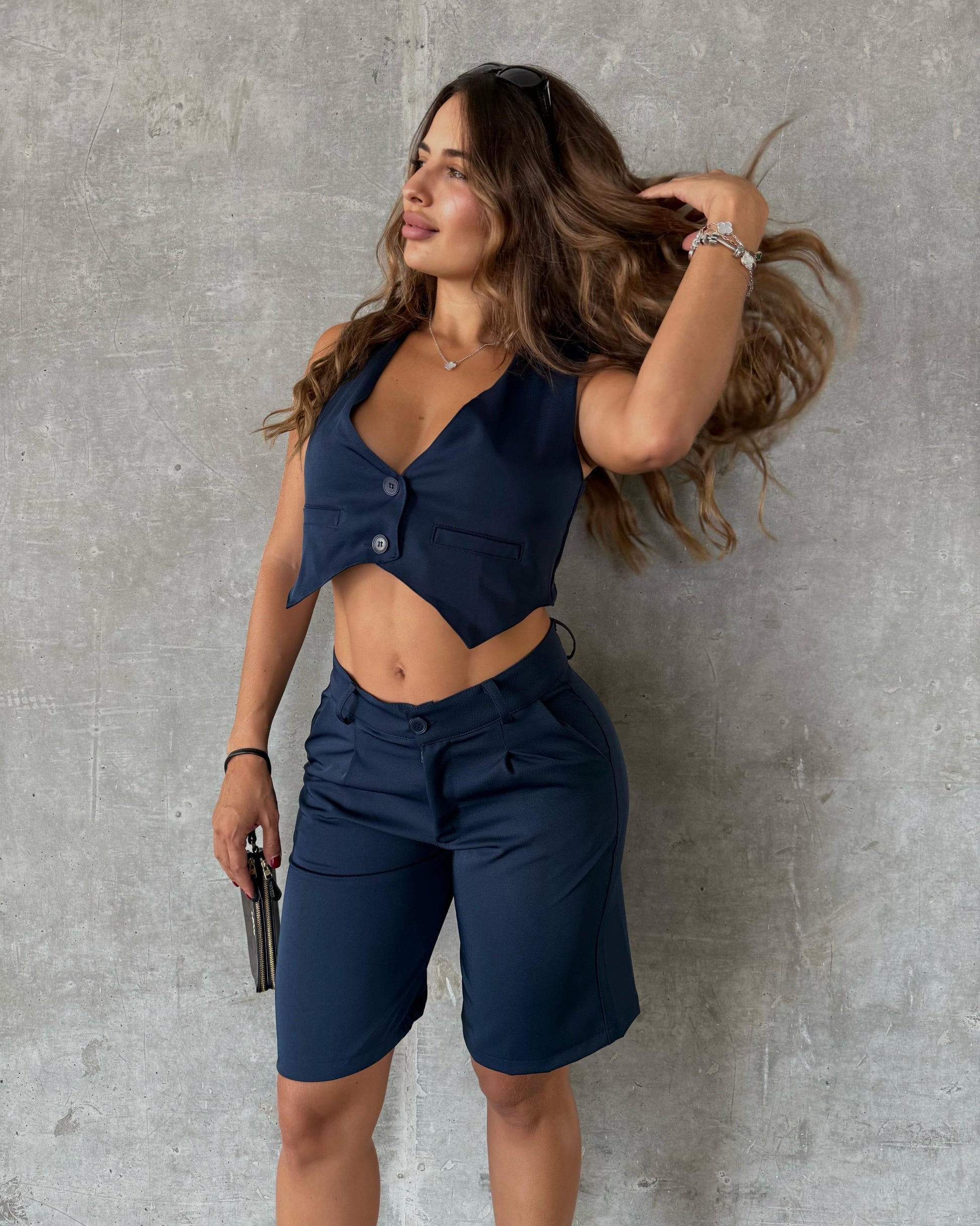 Set sastre con un toque audaz y contemporáneo. El top tipo chaleco crop se reinventa con un corte asimétrico y escote en “V”, aportando una silueta moderna, atrevida y muy femenina. Su diseño ajustado realza la figura, mientras que los botones al frente y el bolsillo simulado le dan ese guiño clásico del sastre tradicional. El short tipo bermuda, de tiro medio y corte estructurado, equilibra la propuesta con un aire urbano y versátil. Un look ideal para destacar con personalidad, frescura y estilo en días cálidos o encuentros informales con actitud.