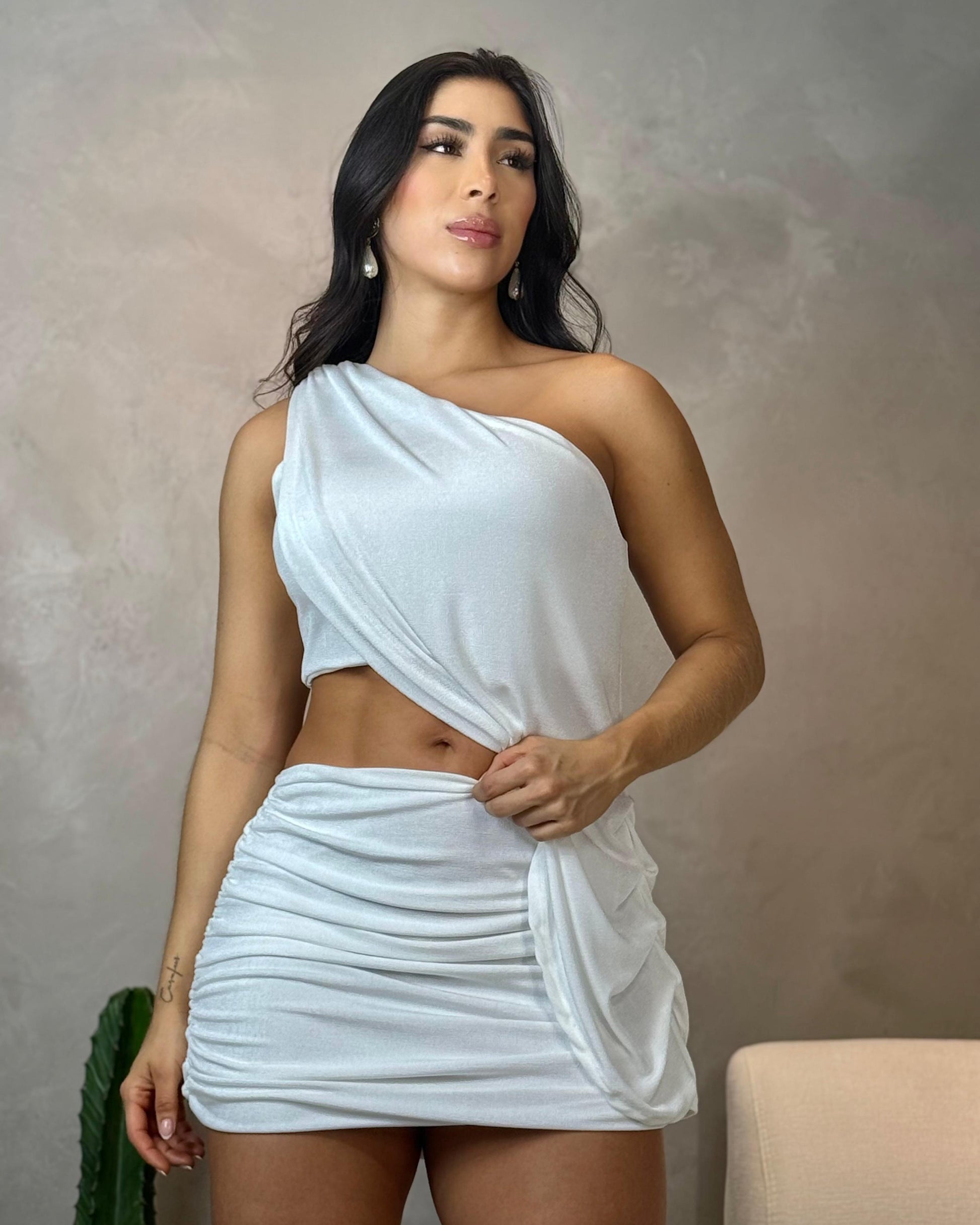El top asimétrico de un solo hombro aporta elegancia y un toque moderno, mientras que la falda ajustada con recogidos laterales realza la figura y estiliza la silueta.