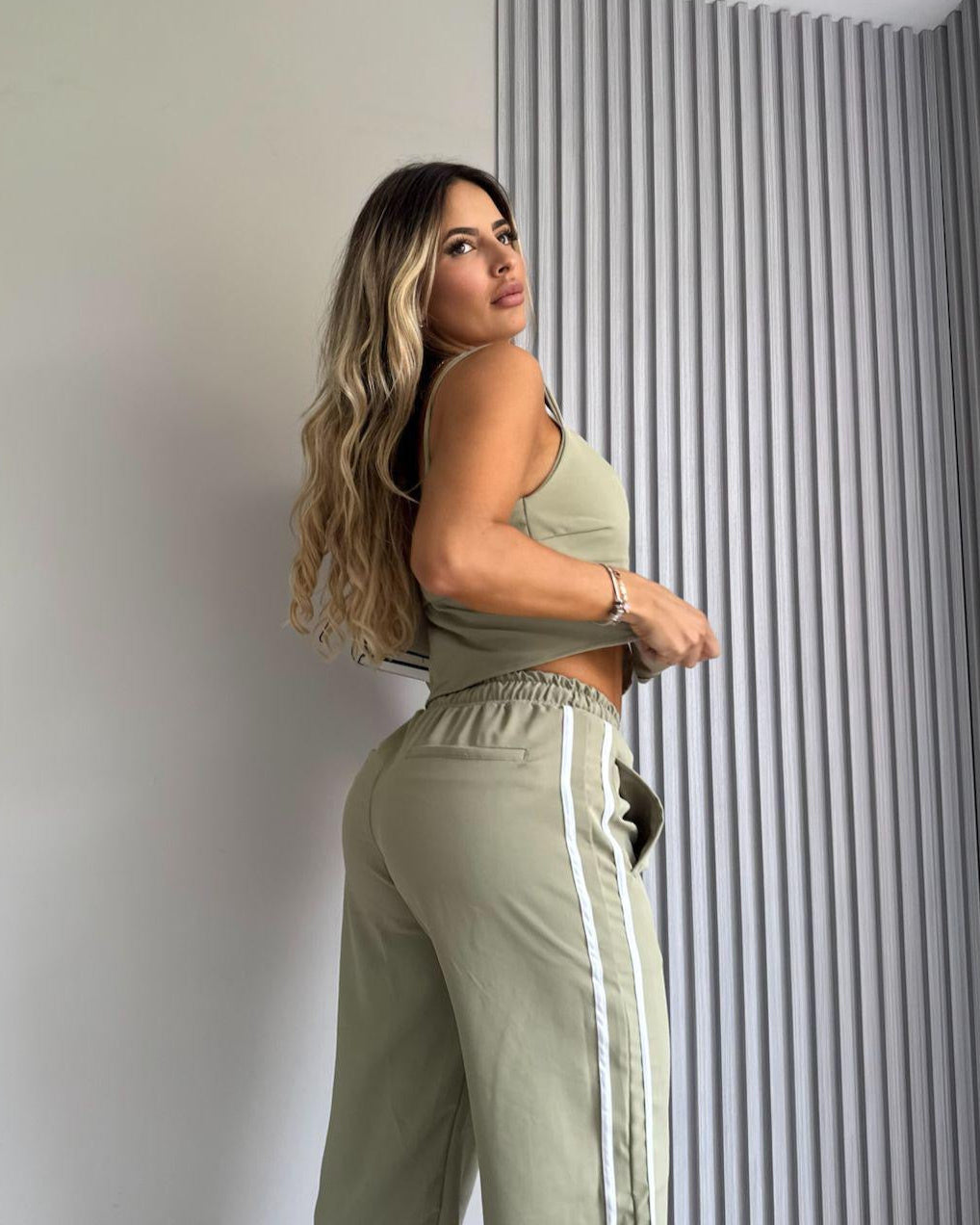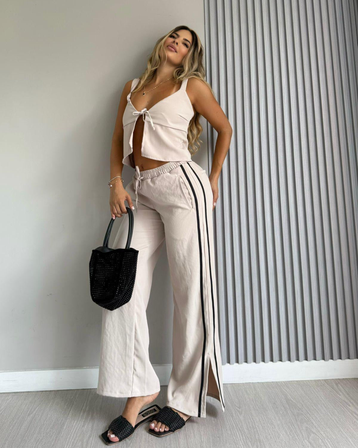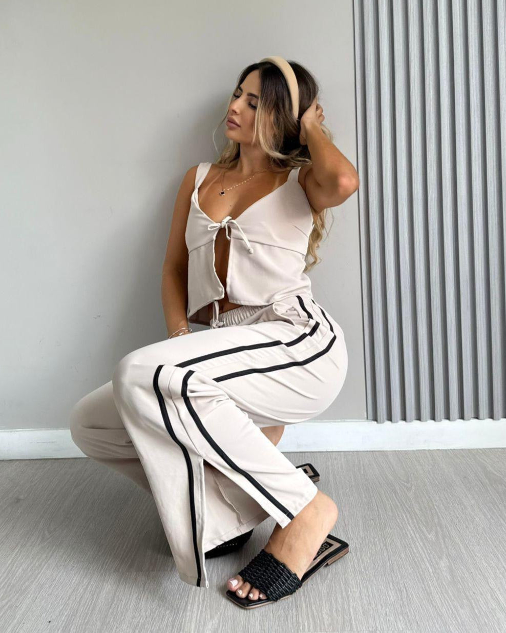Set en tela tipo vivaldi, compuesto por una blusa con tirantes anchos y amarre frontal que permite ajustar el escote, y un pantalón de tiro alto con pretina elástica, caída recta y abertura lateral en bota. El pantalón incluye dos franjas negras laterales que estilizan la figura y le dan un toque deportivo y moderno. Ideal para looks relajados pero con mucho estilo. Combínalo con sandalias o tenis para un outfit casual y fresco.