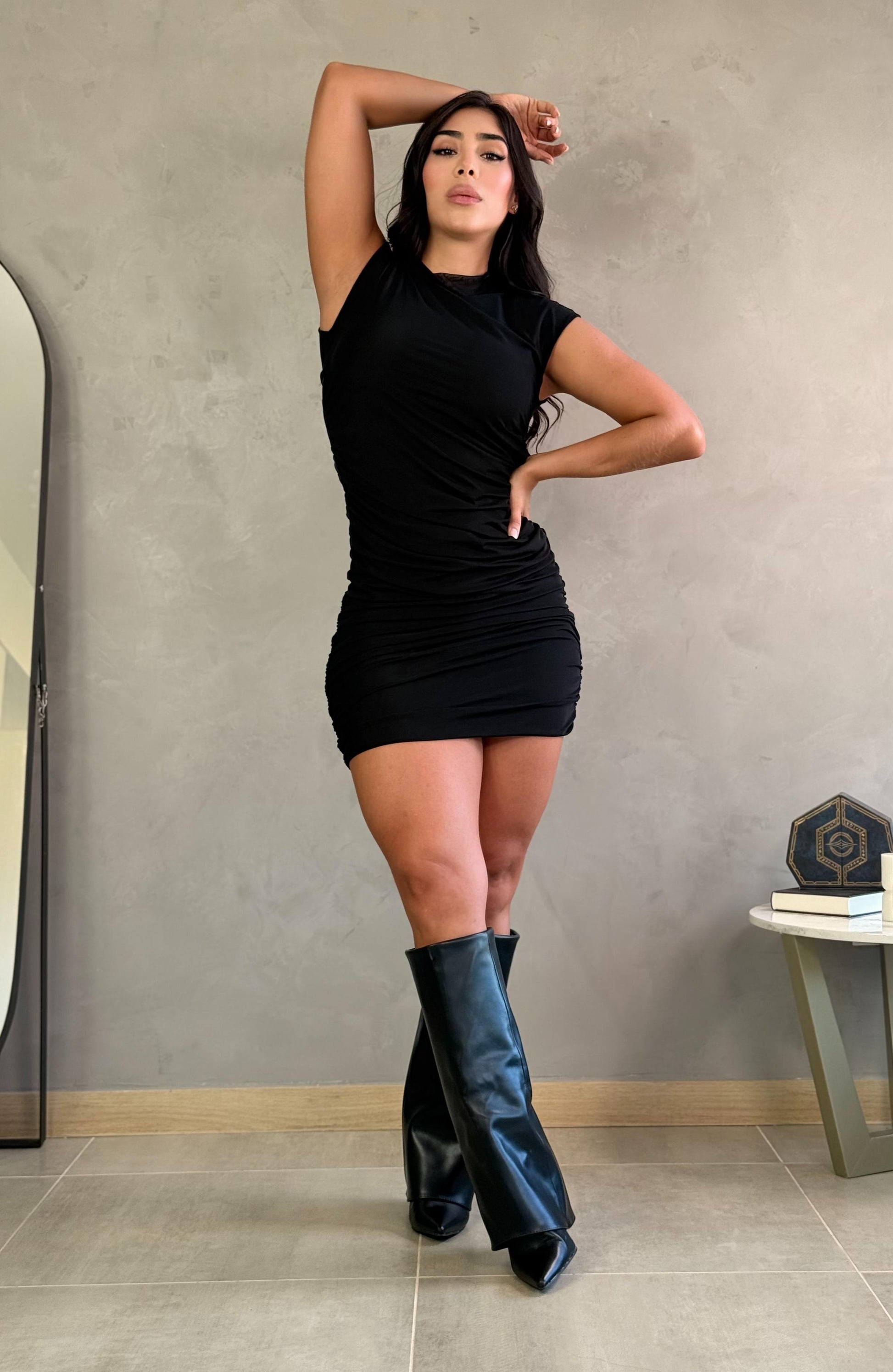 Vestido de largo graduable y ajustado y detalles estratégicos de recogida que realzan cada curva. Su escote espalda descubierta aporta un toque sensual y cómodo, mientras que el drapeado posterior estiliza y crea un efecto de figura esculpida. Tejido en malla que se adapta al cuerpo.